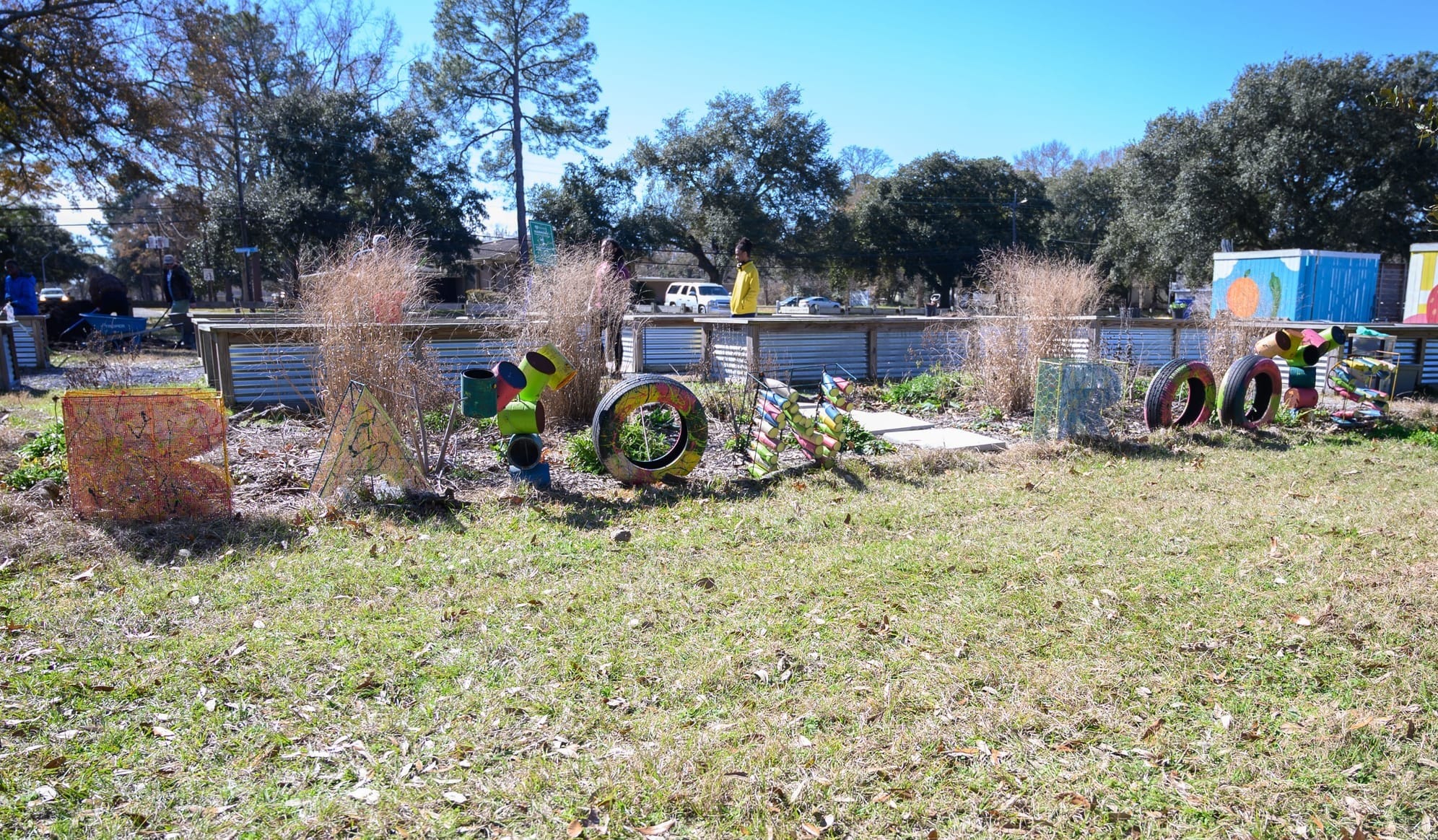 The garden features various raised beds and an inground garden, used throughout the year for different produce, depending on the season. Colorful metal sculptures spell out Baton Roots and mark the spot where the crops grow. Volunteers gathered in gardening gloves with wheelbarrows and shovels in hand one recent Saturday as they prepared the beds for a seasonal change.