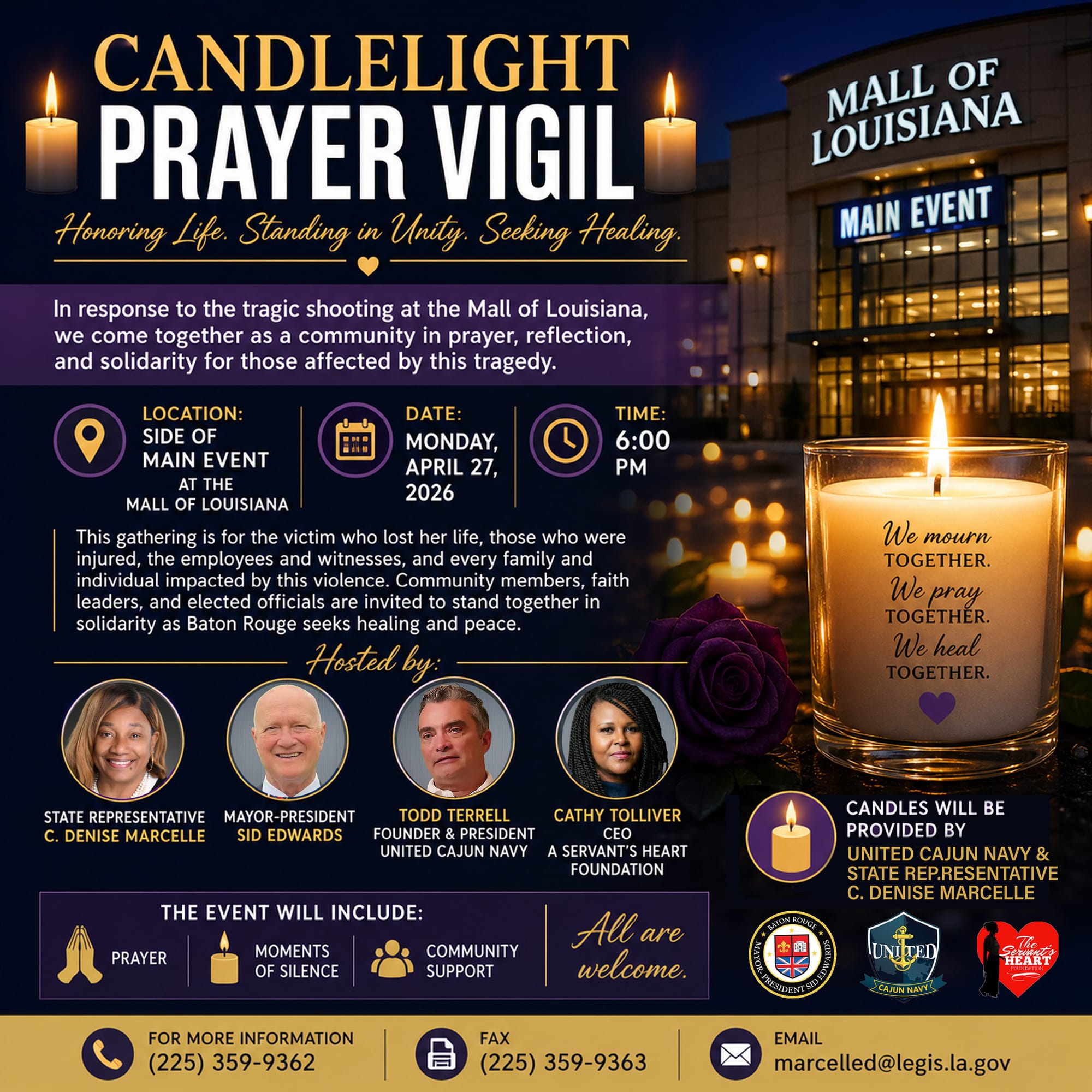 State Rep. C. Denise Marcelle, Mayor-President Sid Edwards, Todd Terrell — founder and president of the United Cajun Navy — and Cathy Tolliver, CEO of The Servant’s Heart Foundation, will host the vigil at 6 p.m. on April 27 near the Main Event entrance of the mall.