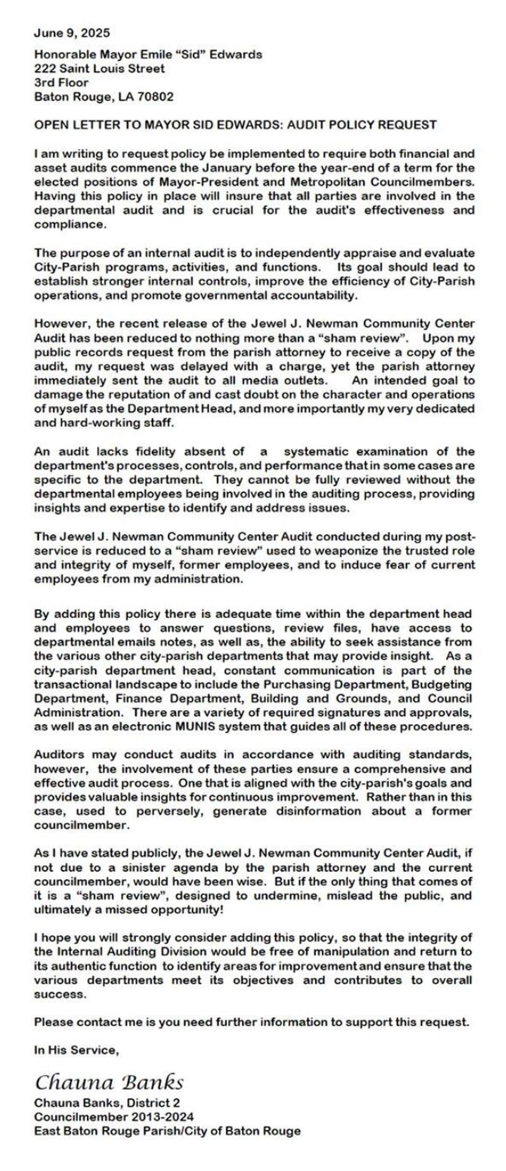 In an open letter to Mayor-President Sid Edwards, Banks rejected the audit’s findings, which allege years of mismanagement and missing assets at the North Baton Rouge facility. She insists the review is less about accountability and more about retribution.