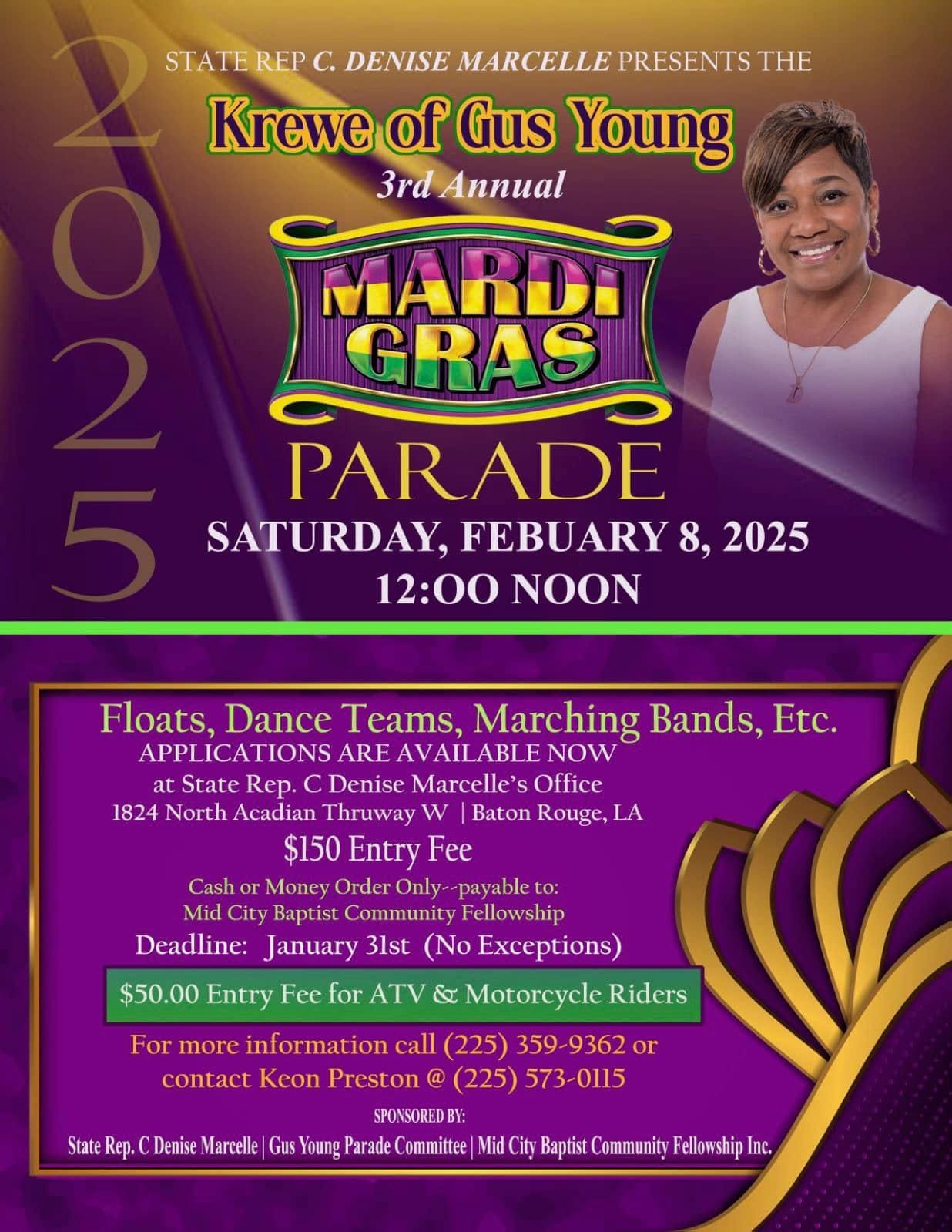 Presented by State Rep. C. Denise Marcelle, the Gus Young Parade Committee, and the Mid City Baptist Community Fellowship, this year’s parade is shaping up to be the best yet. Mark your calendars, grab your beads, and let’s make Mardi Gras 2025 a celebration to remember!
