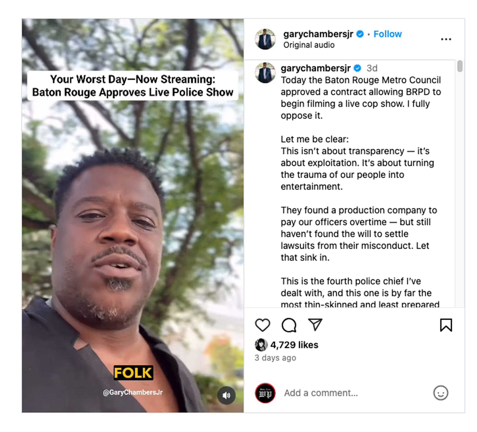 Gary Chambers Speaks Out Alone as Baton Rouge Quietly Approves Police Reality Show Deal