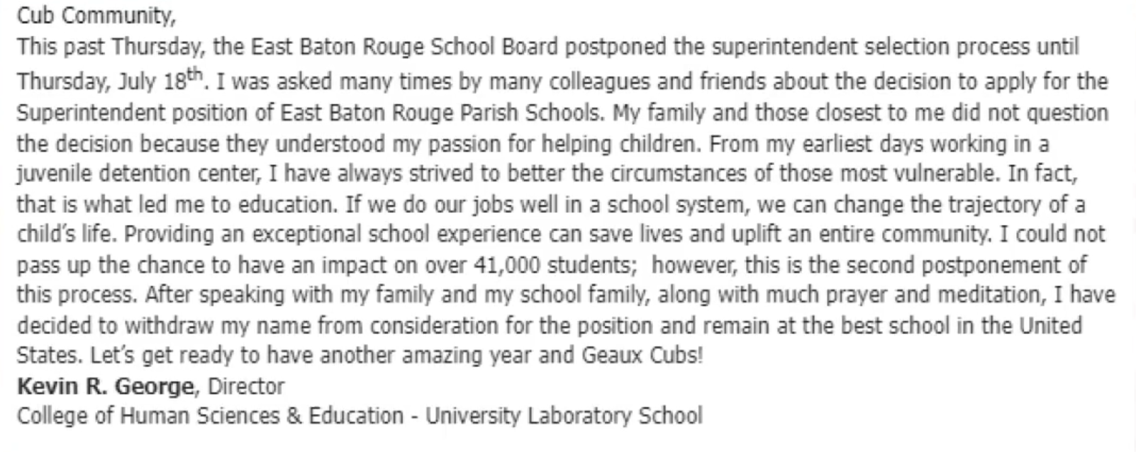 George revealed his decision in an email to LSU lab school parents, citing the repeated delays in the EBR superintendent search as a significant factor. "I have a permanent job that I really have to figure out what's best for everyone involved," George explained.